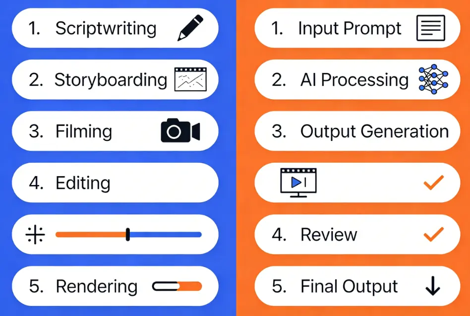 [Image: Comparison showing traditional synthesis workflow versus AI-generated video output]